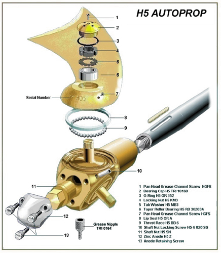 - l'hélice fixe: Si l'hélice a été correctement choisie et que ses performances correspondent bien au point de fonctionnement du bateau, les hélices fixes pour voilier restent tres éfficace pour les bateaux naviguant souvent sous moteur (Meditteranée par exemple soit il n'y a pas de vent soit c'est la tempete...non je rigole). Efficace uniquement si la vitesse du bateau et la vitesse de rotation du moteur correspond au point de fonctionnement optimum de l'hélice. En fait peu de navigateurs à la voile connaissent le point de fonctionnement de leur hélice et la propulsion par moteur reste un organne de sécurité et de dépannage, alors le rendement de leur hélice est détail non prioritaire. Si l'on fait abstraction de la trainée c'est la meilleur hélice au niveau rapport qualité prix (400 € neuve