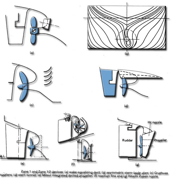 Comme nous l' avons vu dans le bref résumé de l' évolution des formes de l' helice de bateau durant les siecles derniers, les formes et systemes proposant des améliorations des performances de l' helice de bateau se sont multipliés. L'enjeu économique et ecologique est important. L 'amélioration du rendement des hélices des bateaux peut permetre d'économiser de l'énergie. Les systemes permettant d'augmenter l'efficacite d' une helice de bateau peuvent etre classés en trois catégories suivant leur emplacement:(d'apres reference Carlton)