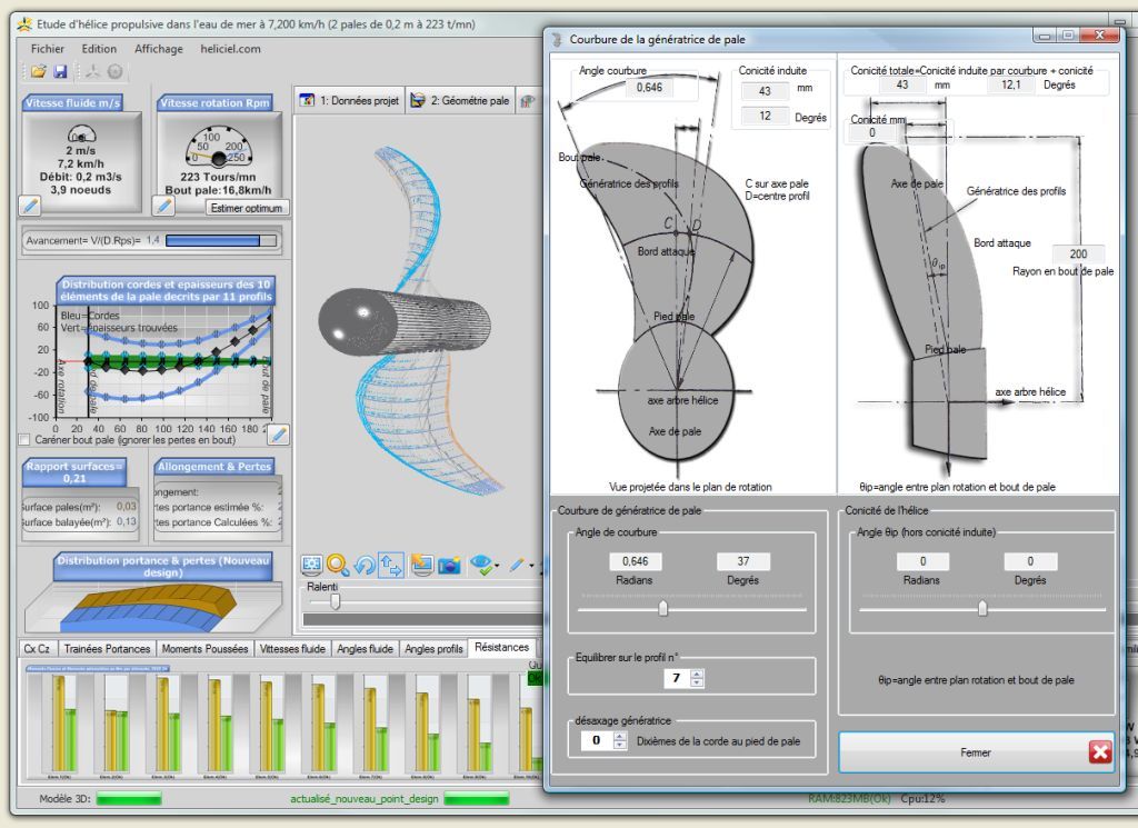 La courbure de génératrice de pales n' est pas prise en compte dans les calculs de performances et de résistance. Dans Héliciel, les pales à génératrices droite ou courbes auront les mêmes résistances et performances, alors que dans la réalité la courbure de pale influe sur ces paramètres.3:Optimiser.